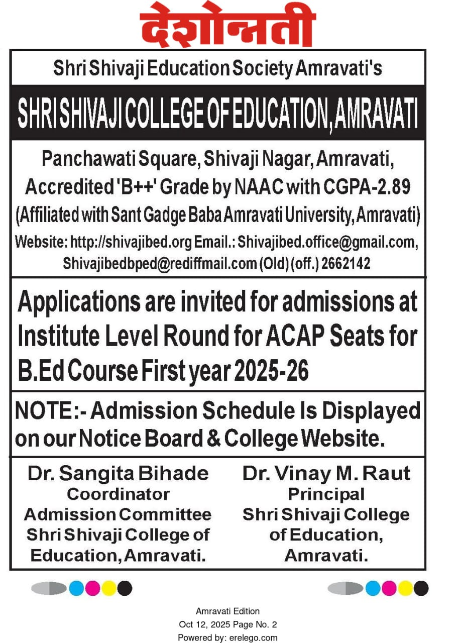 Shri Shivaji College of Education was established in June 1960 and is run by well known Shri Shivaji Education Society, Amravati founded by Dr. Panjabrao Deshmukh. The college is affiliated to Sant Gadge Baba Amravati University, Amravati (M.S.) India and is located in the heart of Amravati city on old N. H. no. 6. The college have two storied building, a huge play ground, boy's and girl's hostels and ample resources required for Education and Physical Education studies. Principal and the staff of college always take initiatives to conduct various activites and exert for the betterment of student's mental and physical performance.